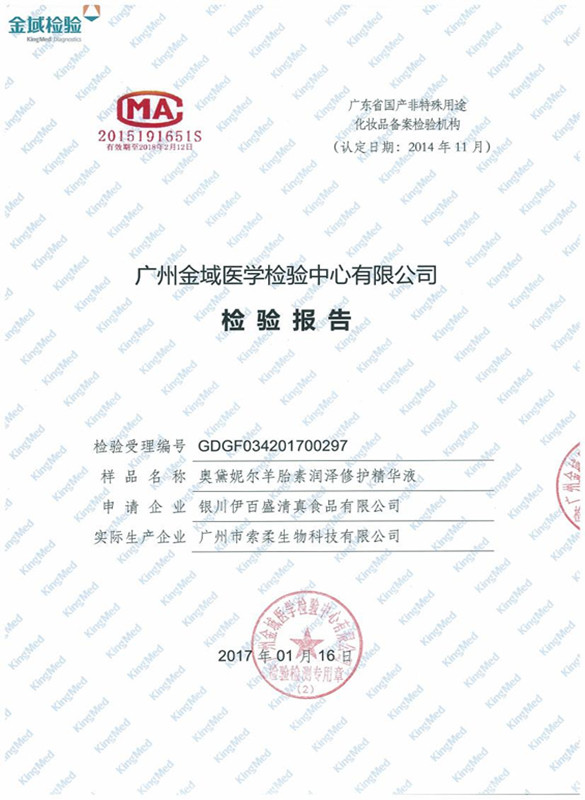 奧黛妮爾羊胎素潤澤修護精華液檢驗報告